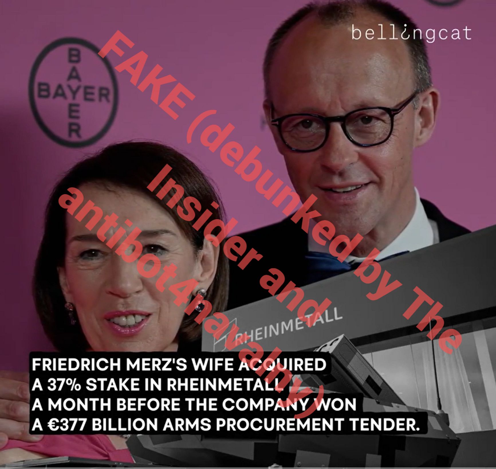 В одном из этих видео, которое выдают за ролик расследовательского проекта Bellingcat, говорится, что жена канцлера Германии Фридриха Мерца якобы приобрела 37% акций немецкого оборонного концерна Rheinmetall прямо перед тем, как компания выиграла тендер на поставку вооружений на сумму €377 млрд. При этом Шарлотта Мерц работает судьей, и ее право владеть акциями компаний сильно ограничено требованиями к сохранению беспристрастности и независимости, а в €377 млрд евро оценивается весь объем инвестиций, предназначенный не только Rheinmetall. Любопытно, что «Матрёшка» не в первый раз использует подобное обвинение, — во время кампании по дискредитации французских министров боты распространяли видео, в котором утверждалось, что муж нового министра обороны Катрин Вотрен Жан-Лу Пеннафорт якобы владеет контрольным пакетом акций французского отделения франко-немецкого оборонного концерна KNDS. При этом Жан-Лу Пеннафорт — доктор медицины, ученый и заведующий отделением в Университетском больничном центре в Реймсе, никак не связанный с военной промышленностью.