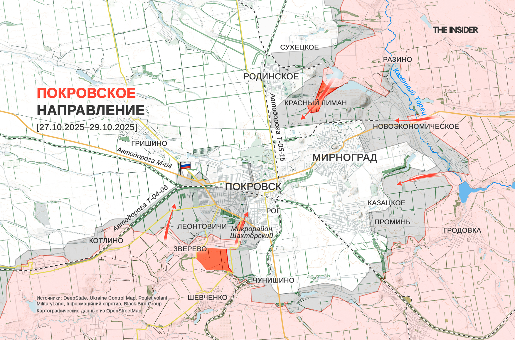 В DeepState зафиксировали продвижение ВС РФ в Покровске и в районе Красного Лимана в сторону трассы Покровск — Доброполье. На карте проекта отметили значительную часть северных районов города как «серую зону». Согласно оценке аналитиков проекта, ширина горловины покровско-мирноградского «кармана», полностью подконтрольной СОУ, составляет менее трех км.