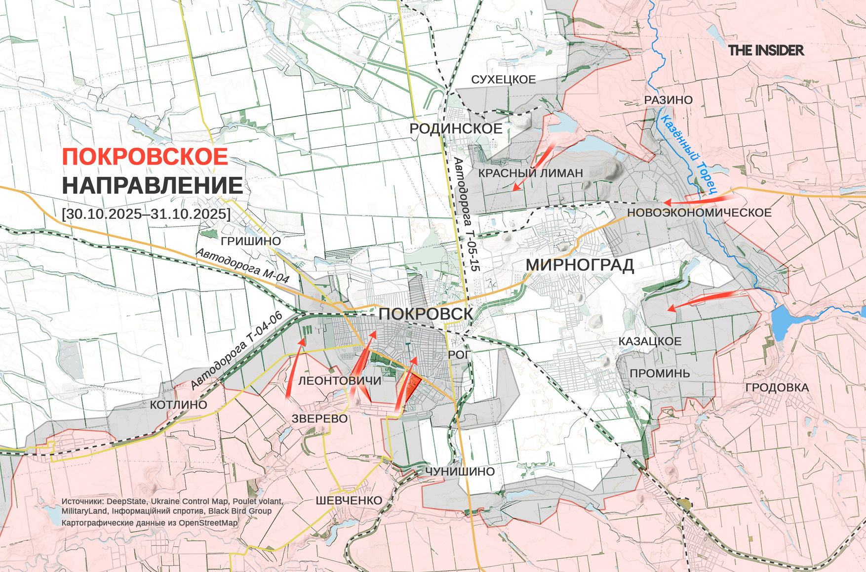 В DeepState зафиксировали дальнейшее продвижение ВС РФ в Покровске. Анатолий Радов оценивает ситуацию в городе более оптимистично — по его оценке, российские силы установили контроль за трассой на Павлоград уже в двух местах. К западу от Покровска ВС РФ подошли к окраинам Гришина, утверждает Радов.