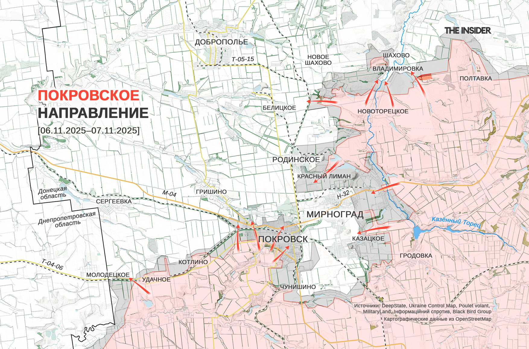 DeepState сообщает, что ВС РФ продвинулись возле села Владимировка у основания Добропольского выступа. Также в проекте отметили, что, по информации Генштаба ВСУ, на покровском направлении российские войска 5 ноября 2025 года провели 100 штурмовых действий. В этом году более высокие показатели отмечались лишь дважды — 3 и 4 апреля.