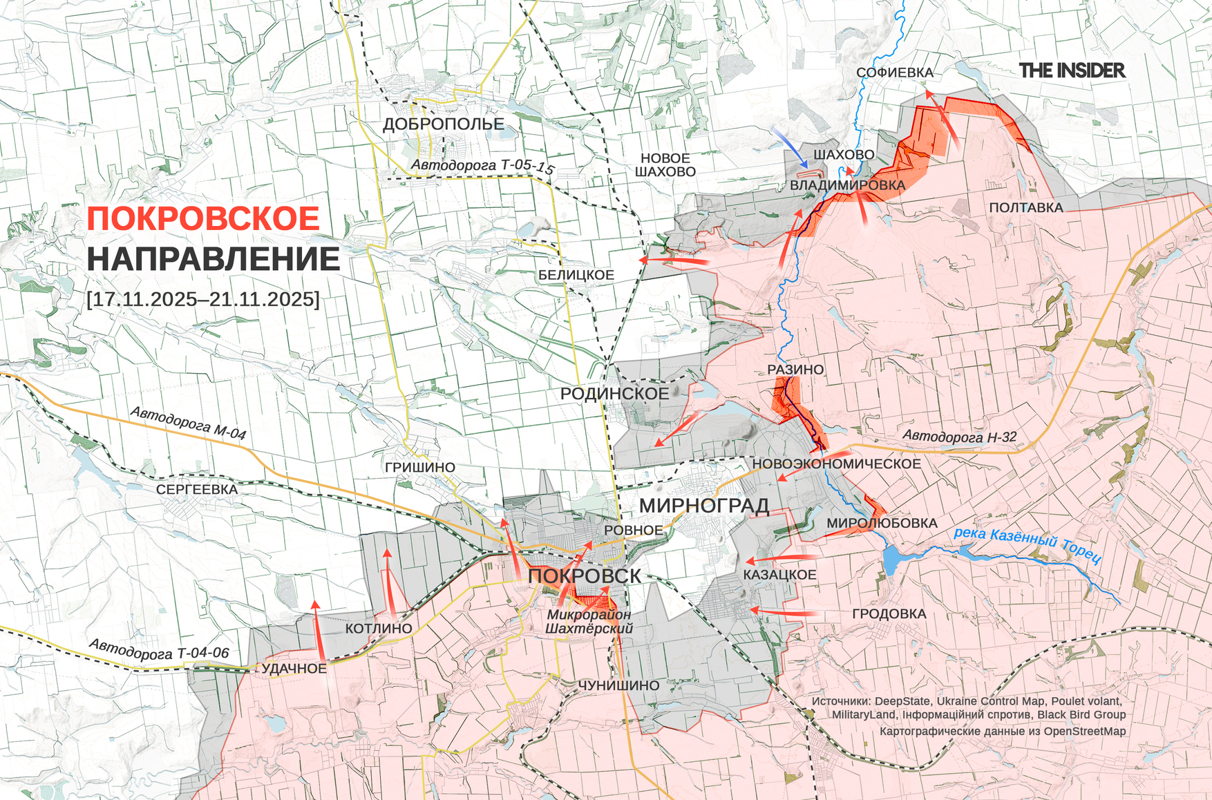 В 7-м корпусе быстрого реагирования ДШВ сообщили, что по состоянию на 10:00 21 ноября СОУ удерживали северную часть Покровска и отдельные позиции в южной части города, а также зачищали северную часть Мирнограда и пресекли попытку ВС РФ «просочиться» в Гришино к северо-западу от Покровска.