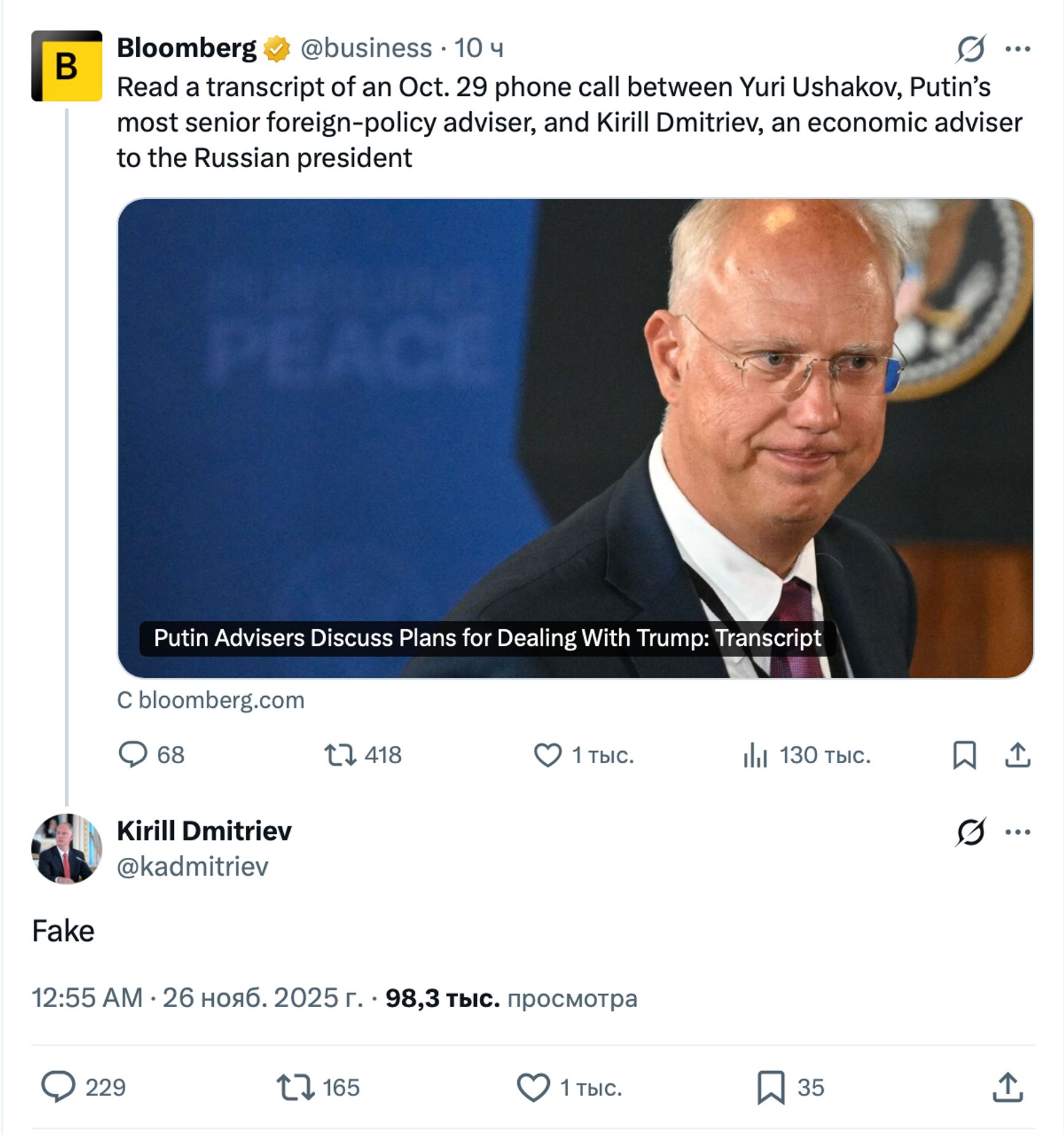 Помощник Владимира Путина Кирилл Дмитриев назвал фейком публикацию Bloomberg, обнародовавшего расшифровки двух телефонных разговоров с обсуждением мирного плана для Украины — беседы спецпосланника США Стива Уиткоффа с помощником Путина Юрием Ушаковым и последовавшей за ним беседы Ушакова с Дмитриевым. Под сообщением Bloomberg в Twitter Дмитриев оставил короткий комментарий: «Фейк».