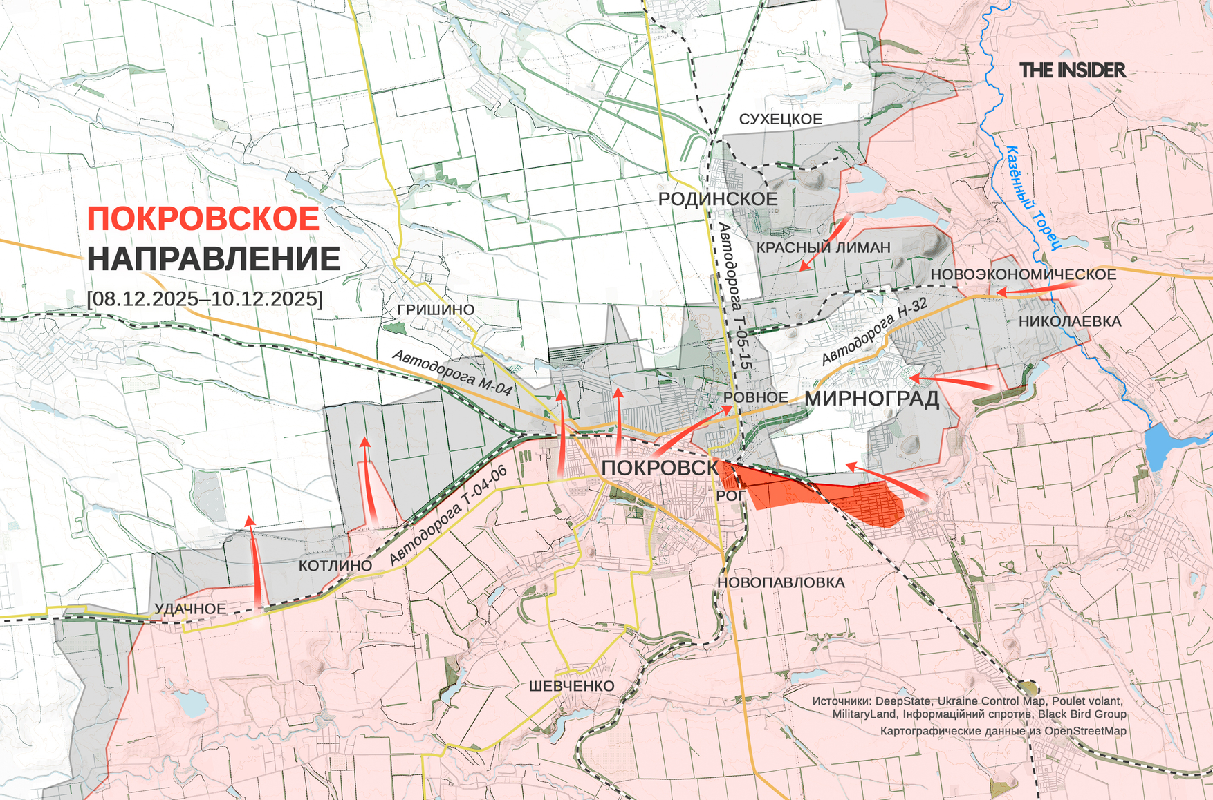 Аналитики DeepState фиксируют продвижение российских войск в Мирнограде (до 2016 года — Димитров) и около Покровска (до 2016 года — Красноармейск). Помимо этого, проект публикует видео с неудачной попыткой ВС РФ атаковать в сторону Гришина силами не менее чем десяти мотоциклов и квадроциклов общей численностью до 40 человек личного состава, характеризуя разгром колонны как черный день для противника.