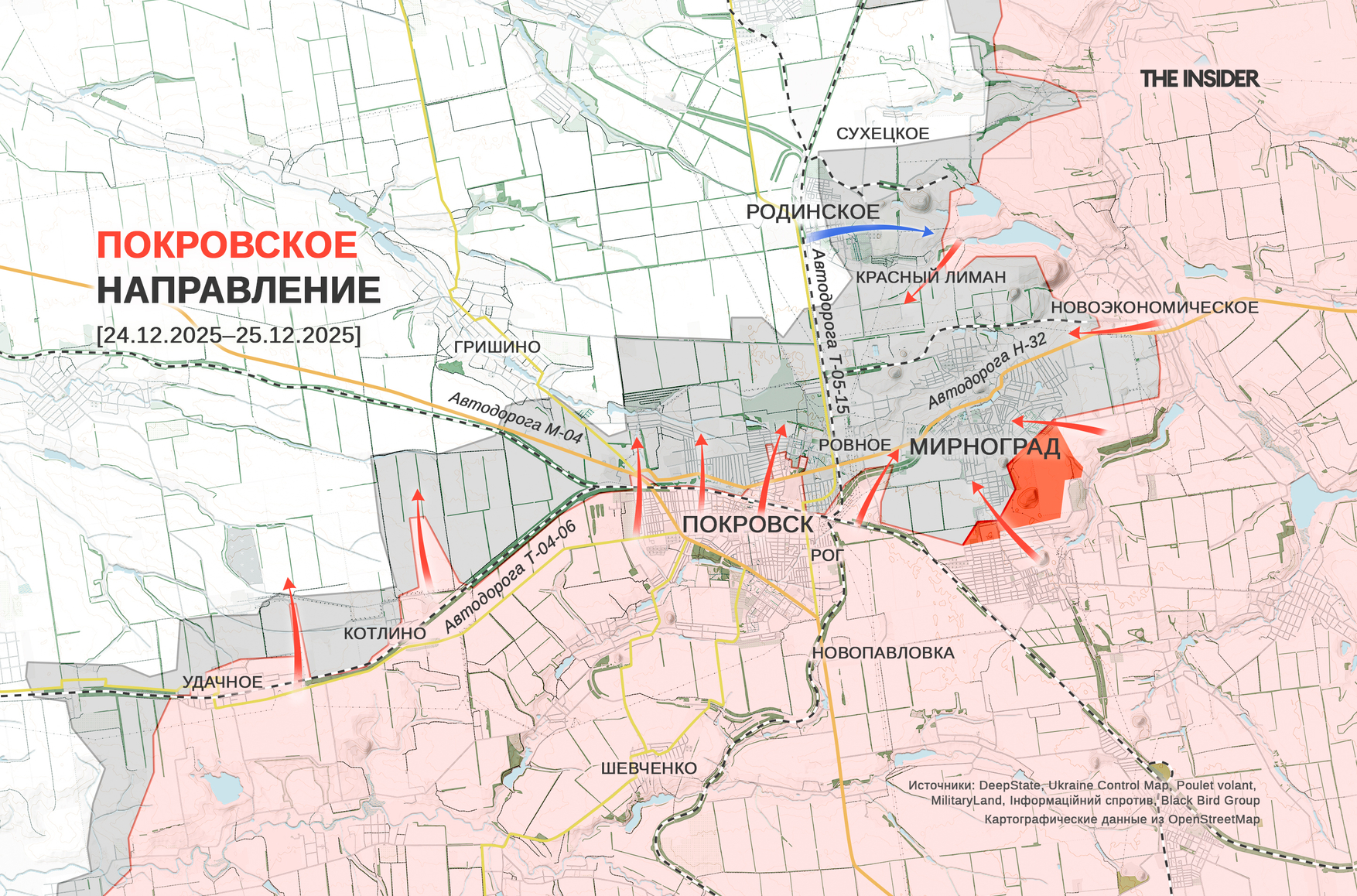В DeepState отметили продвижение российских войск в юго-восточной части Мирнограда (до 2016 года — Димитров). Аналитики «Сливочного каприза» в свою очередь сделали выводы на основе геопривязок о продвижении СОУ в Родинском к северу от Мирнограда и ВС РФ — к северу от Покровска (до 2016 года — Красноармейск).