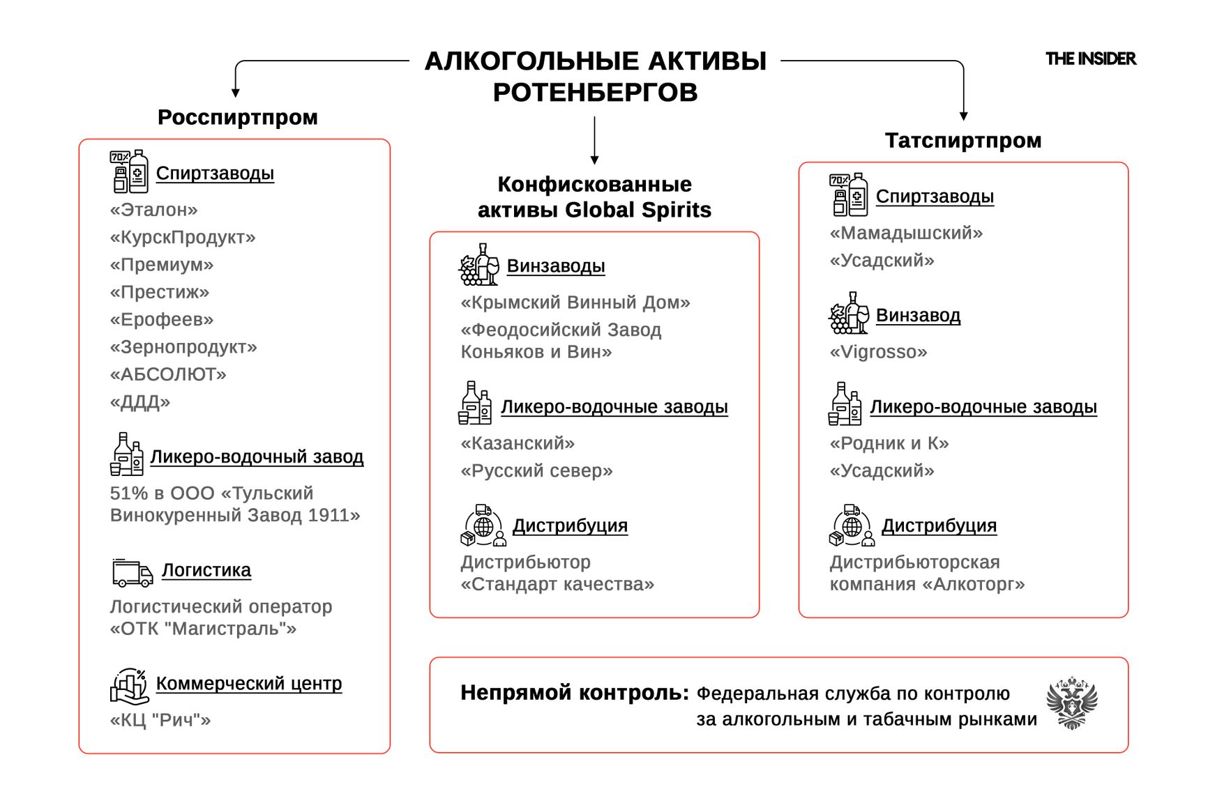 За время полномасштабной войны связанные с Ротенбергом компании оформились в масштабный холдинг. Входящие в него предприятия производят спирт, перевозят спирт на ликеро-водочные заводы, делают из этого спирта алкогольные напитки, выращивают виноград, разливают в России напитки международных брендов и занимаются дистрибуцией своей алкогольной продукции. А главным драйвером этого бизнеса является связь с российскими органами власти, которые могут остановить действие лицензии конкурентов, парализовать работу их заводов или просто экспроприировать их активы.