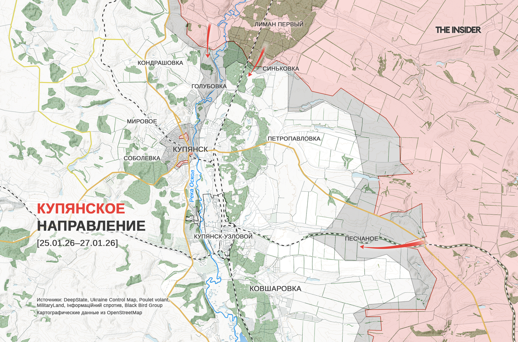 В частности, канал «Белорусский силовик 🇧🇾» привел карту с отметкой зоны украинского контроля — за много километров от Купянска-Узлового. Согласно картам OSINT-проектов DeepState, ISW и Black Bird Group, российские войска даже не приблизились к окрестностям города.