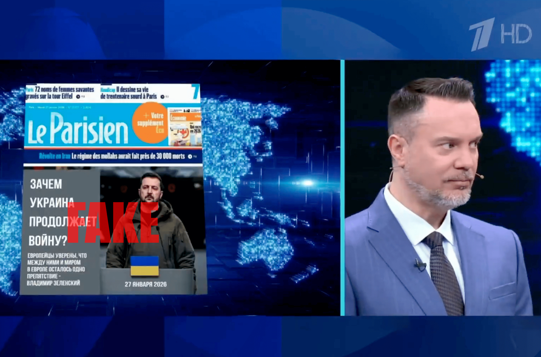 В эфире программы «Время покажет» на Первом канале рассказали о якобы критике Владимира Зеленского со стороны французской прессы и продемонстрировали обложки изданий Libération и Le Parisien. Однако, как выяснилось, показанные в студии первые полосы были поддельными.