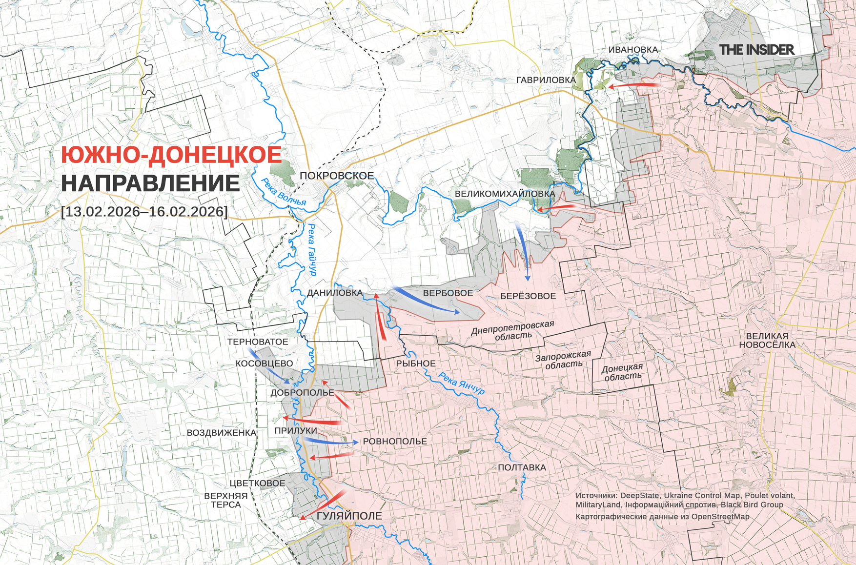В 225-м ОШП отчитались, что в течение 13 февраля убили в районе Гуляйполя 40 российских военных, отправленных «просачиваться» между украинскими позициями ради «флаговтыков». Тем не менее, в Минобороны РФ уже 15 февраля отчитались о захвате Цветкового к северо-западу от Гуляйполя и опубликовали видео «флаговтыка» в селе. «Рыбарь» считает, что теперь российские военные смогут организовать наступление на Верхнюю Терсу, которая имеет большое логистическое значение.
