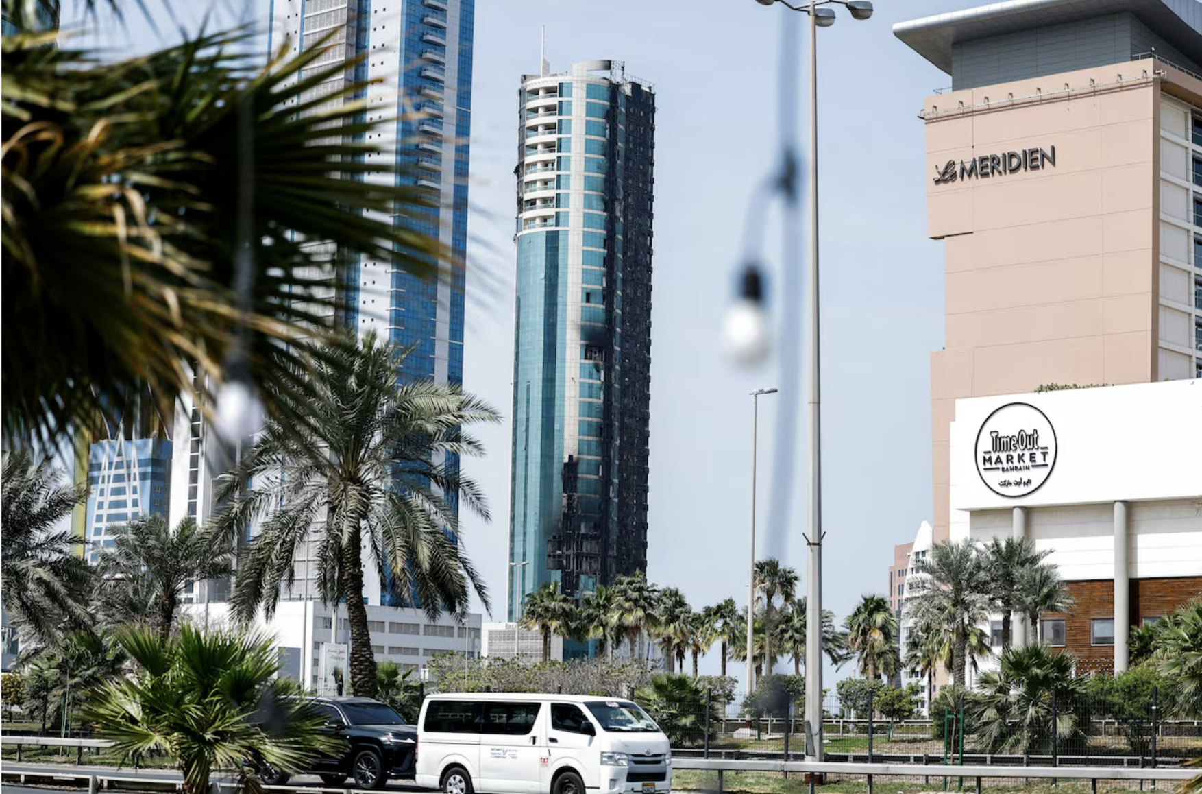 Автомобили проезжают мимо здания, поврежденного иранским беспилотником после ударов Израиля и США по Ирану, в городе Сиф, Манама, Бахрейн, 1 марта 2026 года. REUTERS/Hamad I Mohammed