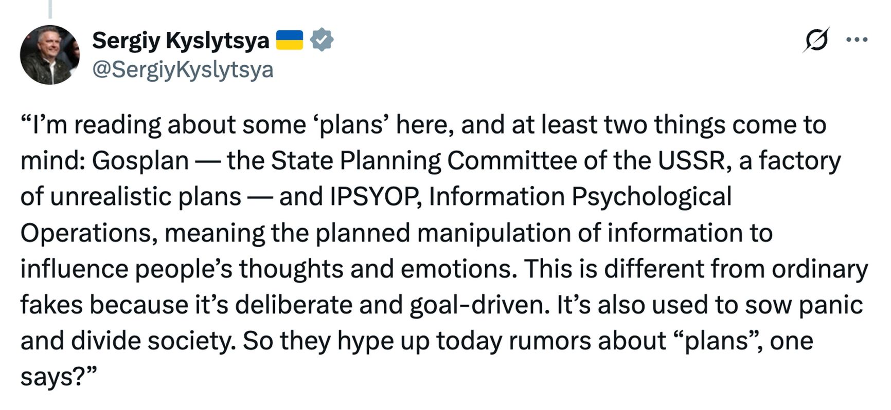 Неудивительно, что, когда плоды трудов Дмитриева стали достоянием гласности, реакция Киева оказалась отнюдь не восторженной. Заместитель министра иностранных дел Украины Сергей Кислица написал в Twitter в ответ на первую статью Axios, что циркулирующие слухи о «мирной сделке» из 28 пунктов напоминают ему советские «активные мероприятия» — «спланированное манипулирование информацией с целью влияния на мысли и эмоции людей... чтобы посеять панику и расколоть общество».
