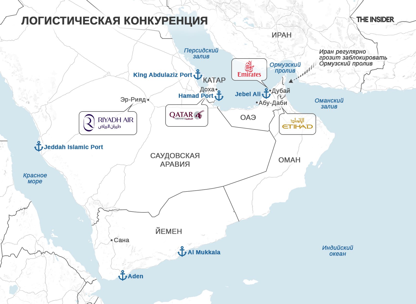 Еще одна линия конкуренции, ставшая особенно заметной на фоне Йемена, — логистика (порты и гражданская авиация). Борьба идет за то, кто станет главным перевалочным пунктом между Европой, Азией и Африкой. И тут число конкурентов больше двух: у ОАЭ это связка Emirates в Дубае и Etihad в Абу-Даби, у Катара это Qatar Airways в Дохе.